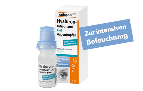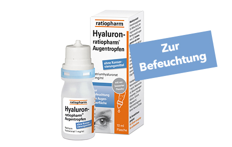 Hyaluronsäure kann im Vergleich zu anderen Stoffen ein Vielfaches seines Gewichts an Wasser binden. Der Wirkstoff dient daher als Feuchthalter. Somit schützen Hyaluron-ratiopharm® Augentropfen und Hyaluron-ratiopharm® Gel Augentropfen das Auge aktiv vor dem Austrocknen und die Zellen im Auge können ausreichend mit Sauerstoff und Nährstoffen versorgt werden. Eine weitere Besonderheit der Hyaluronsäure ist ihre Fähigkeit, den Tränenfilm zu stabilisieren und so zusätzlich das Auge zu schützen.