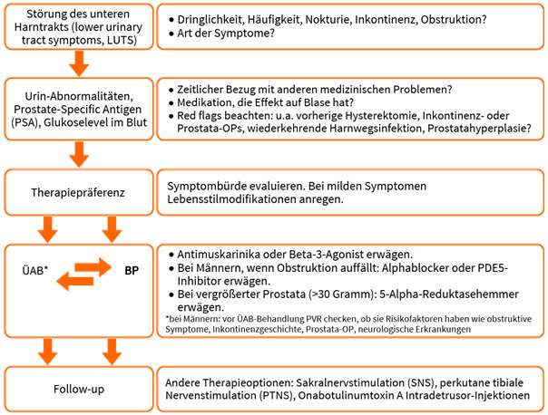 Für die spätere Therapie ist es wichtig, eine idiopathische ÜAB sicher von einer ÜAB mit anderen Ursachen abzugrenzen, beispielsweise ÜAB durch benigne Prostatahyperplasie (BP), Prostata- oder Harnblasenkarzinome, Harnwegsinfekte oder interstitielle Zystitis.7 Bei Männern kommen zahlreiche Differenzialdiagnosen in Betracht, die zu irritativen Miktionsbeschwerden (LUTS) führen können: